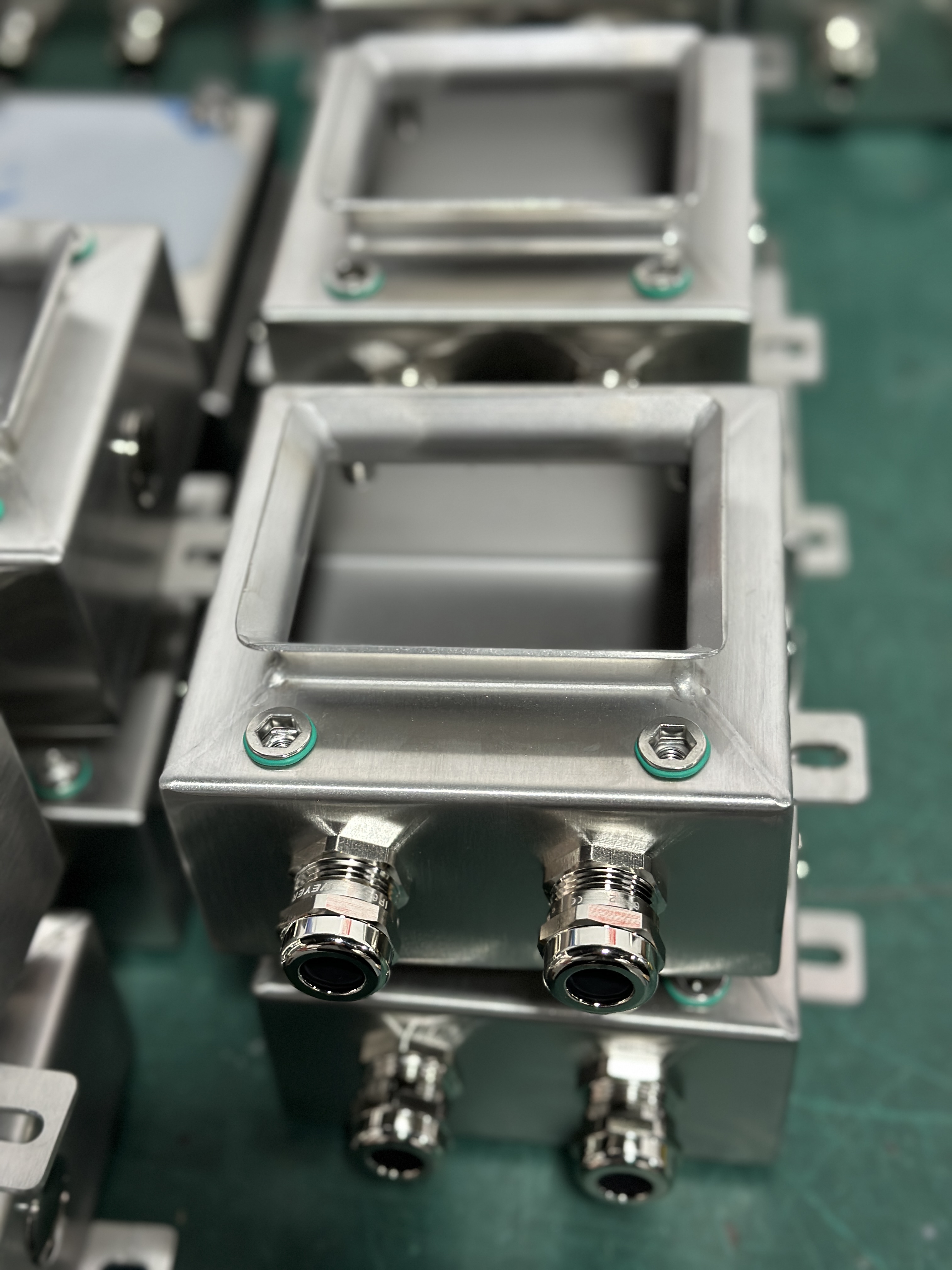 空接线盒,SUS304不锈钢材质,表面拉丝处理,WAGO接线端子264-721/4 PCS,端板264-368,标记条2009-145,电缆格兰HSM-M20(7-14)-EJ可配导轨,可装按钮,可装连接器,可装接线端子等各种组装 颜色:不锈钢本色。